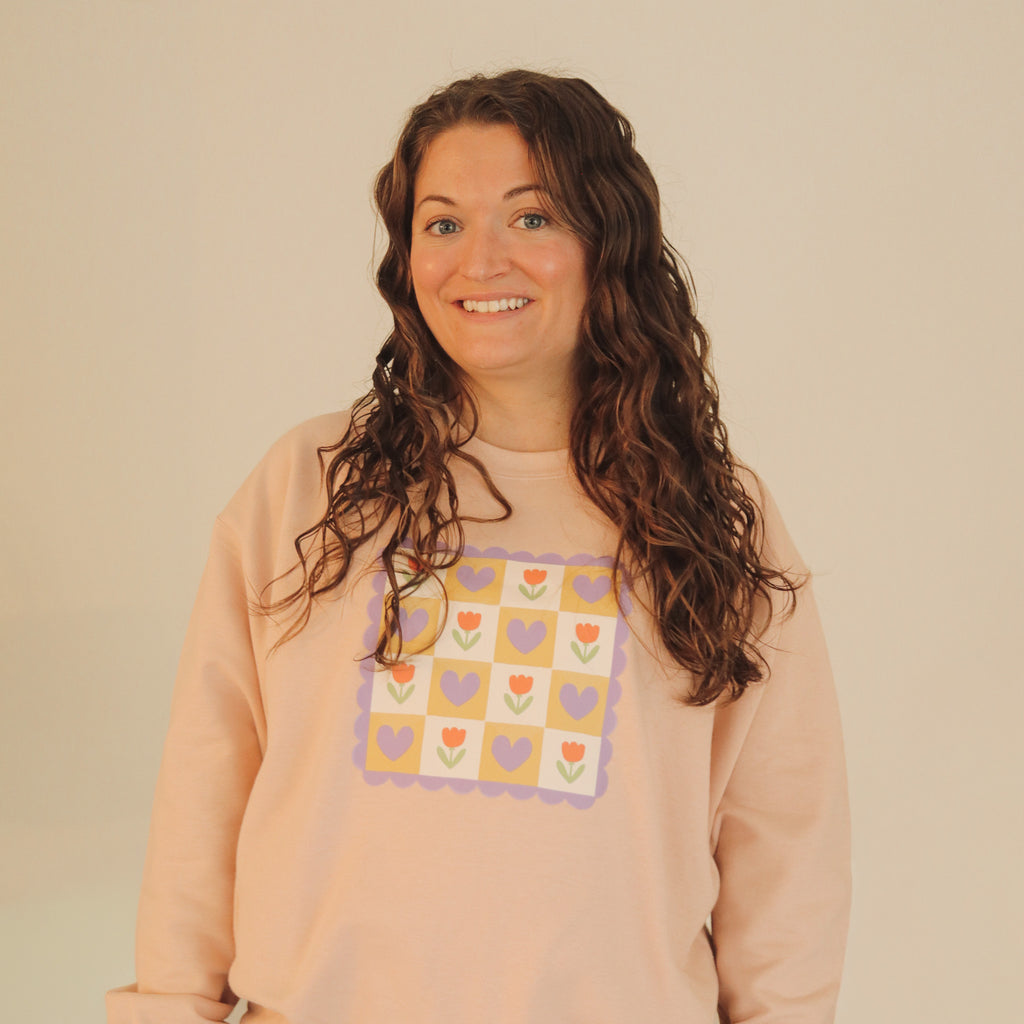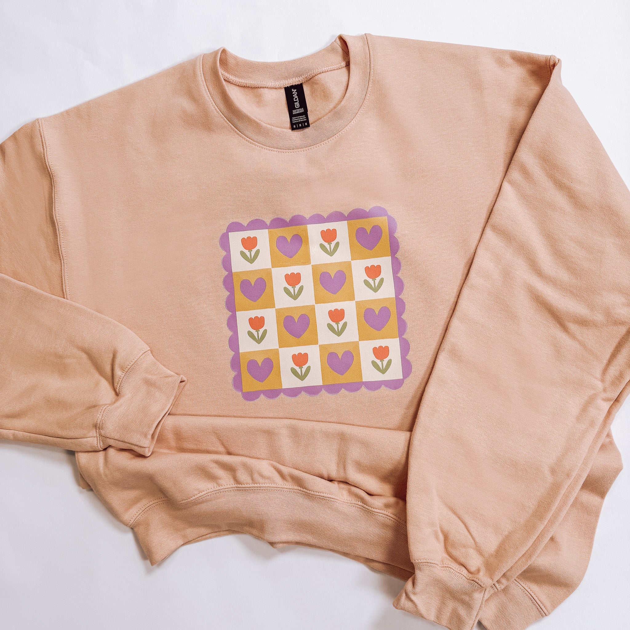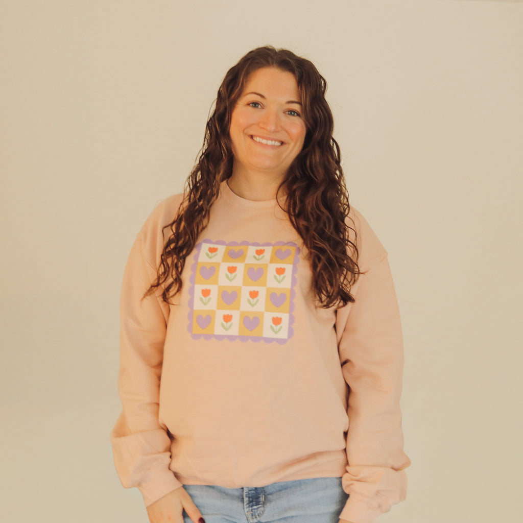 Drawn by Mira and turned into a pattern, this Cozy Tulips sweatshirt is perfect for those chilly days! The inside is especially soft, as we are trialing a different sweatshirt in the Gildan line!