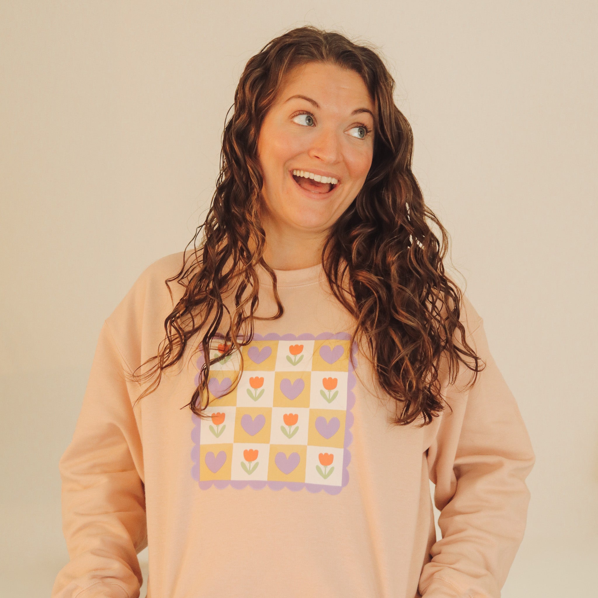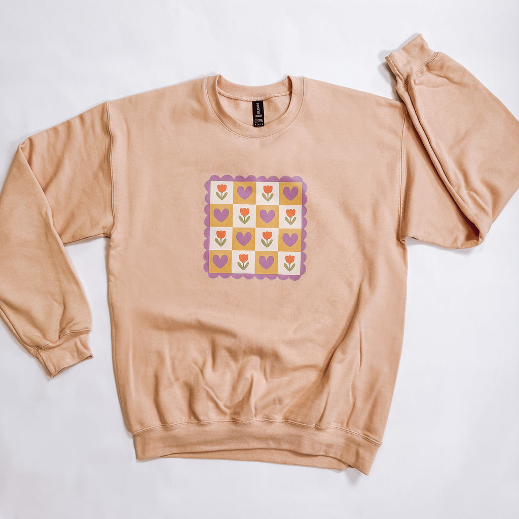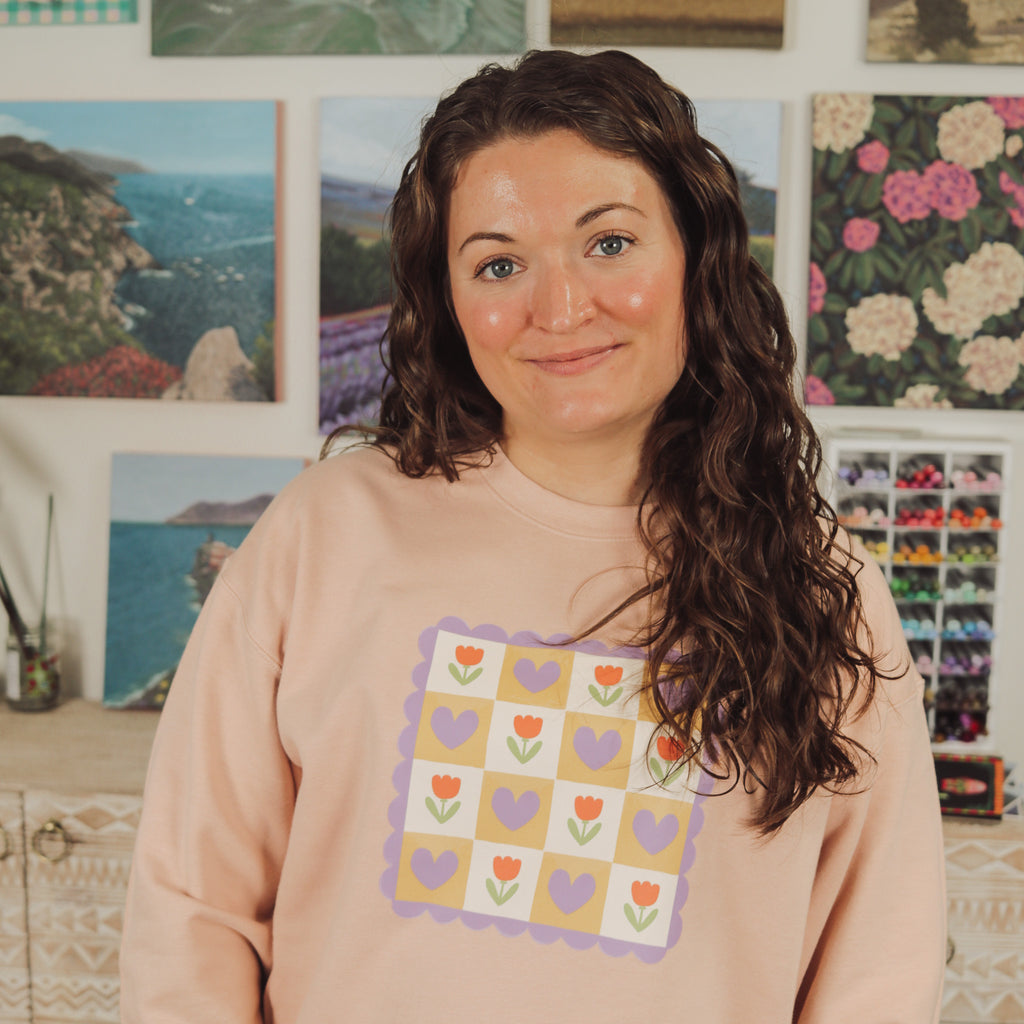 Drawn by Mira and turned into a pattern, this Cozy Tulips sweatshirt is perfect for those chilly days! The inside is especially soft, as we are trialing a different sweatshirt in the Gildan line!