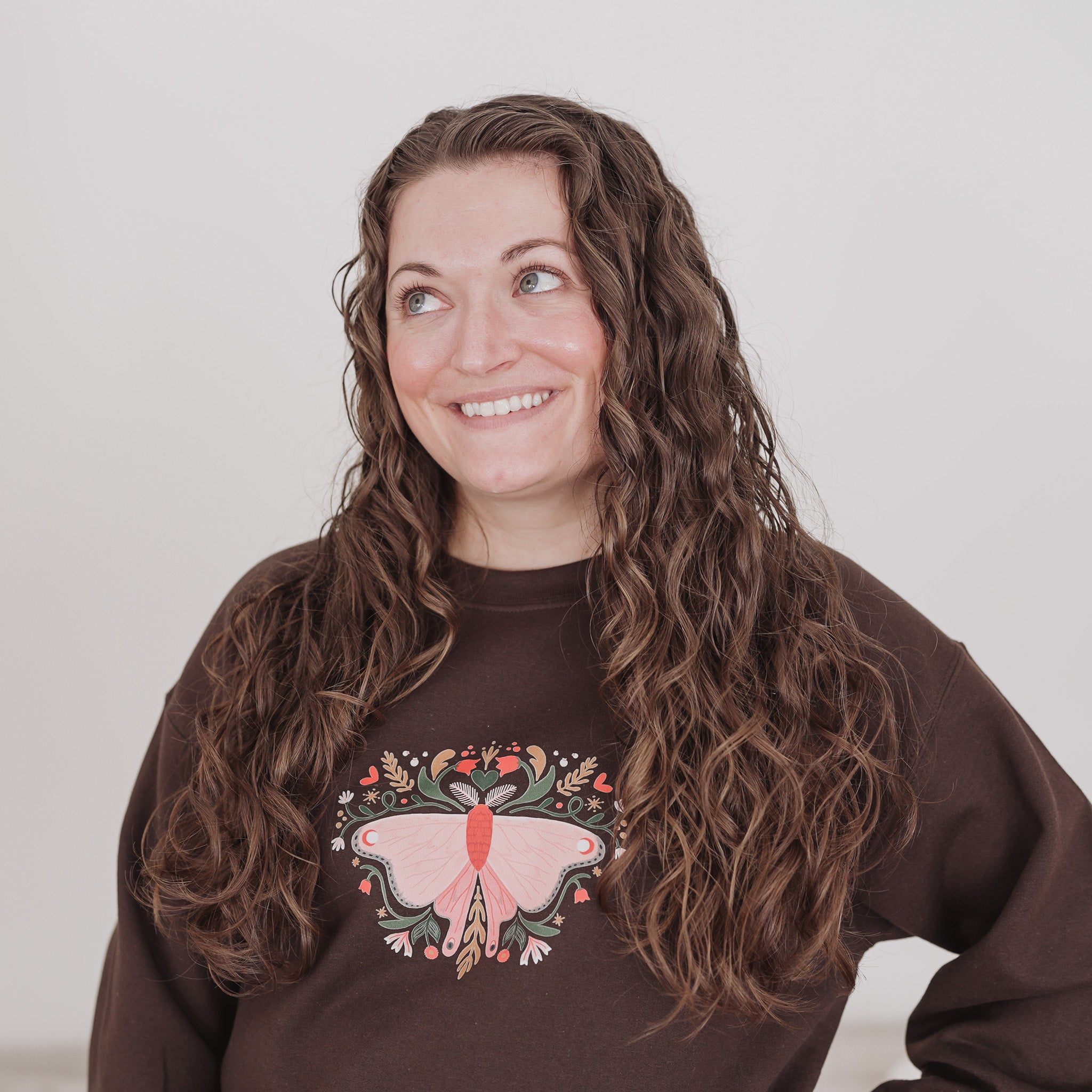 I drew this design probably around 2 years ago. It became a best-selling sticker and sold out. With colder days around, it seemed like the perfect cozy thing for a sweatshirt! The inside is especially soft, as we are trialing a different sweatshirt in the Gildan line!
