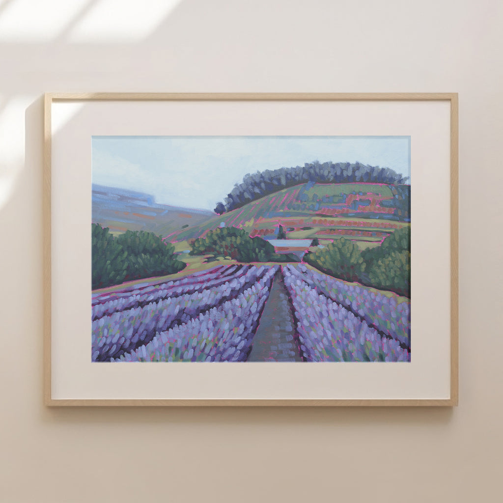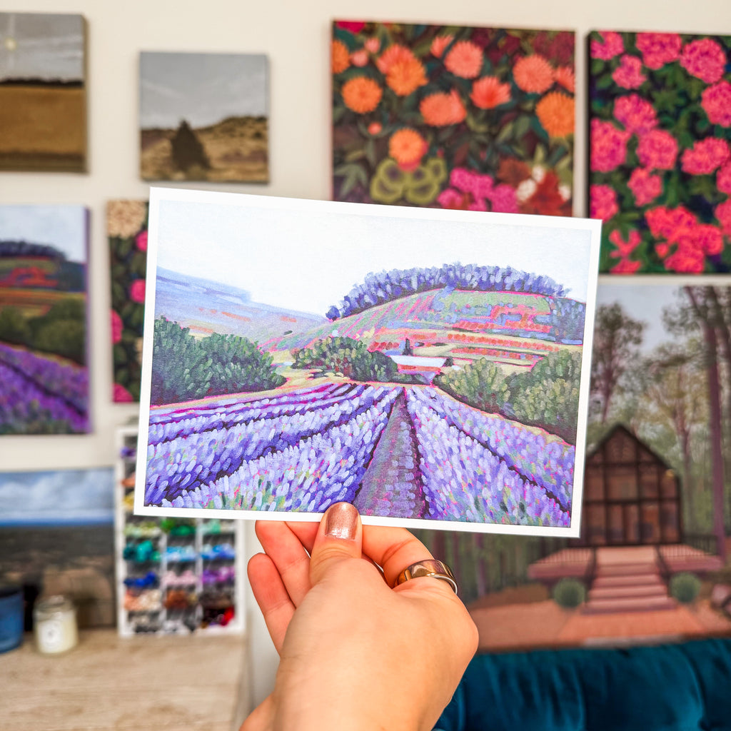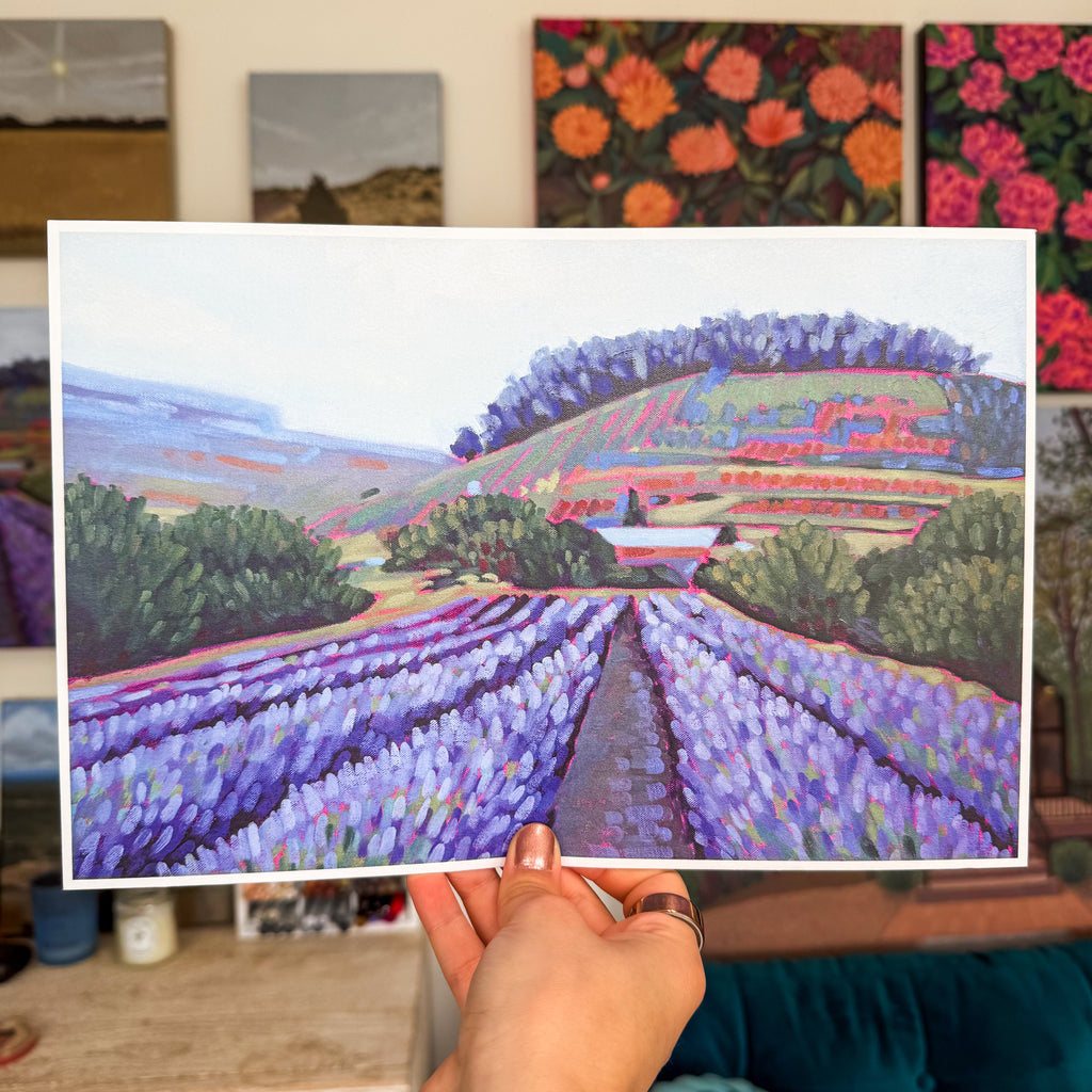 This scene is a place I'd love to visit, but sadly haven't been there. I've spent so much time dreaming of lavender fields while gardening. I only have a few little lavender plants, and they smell delightful. I can't imagine how lovely and aromatic standing in a field of lavender must be! I added a touch of whimsy (and bravery) but letting my magenta underpainting boldly leak through different elements of the background and foreground. It's been fun doing more playful brushstrokes!