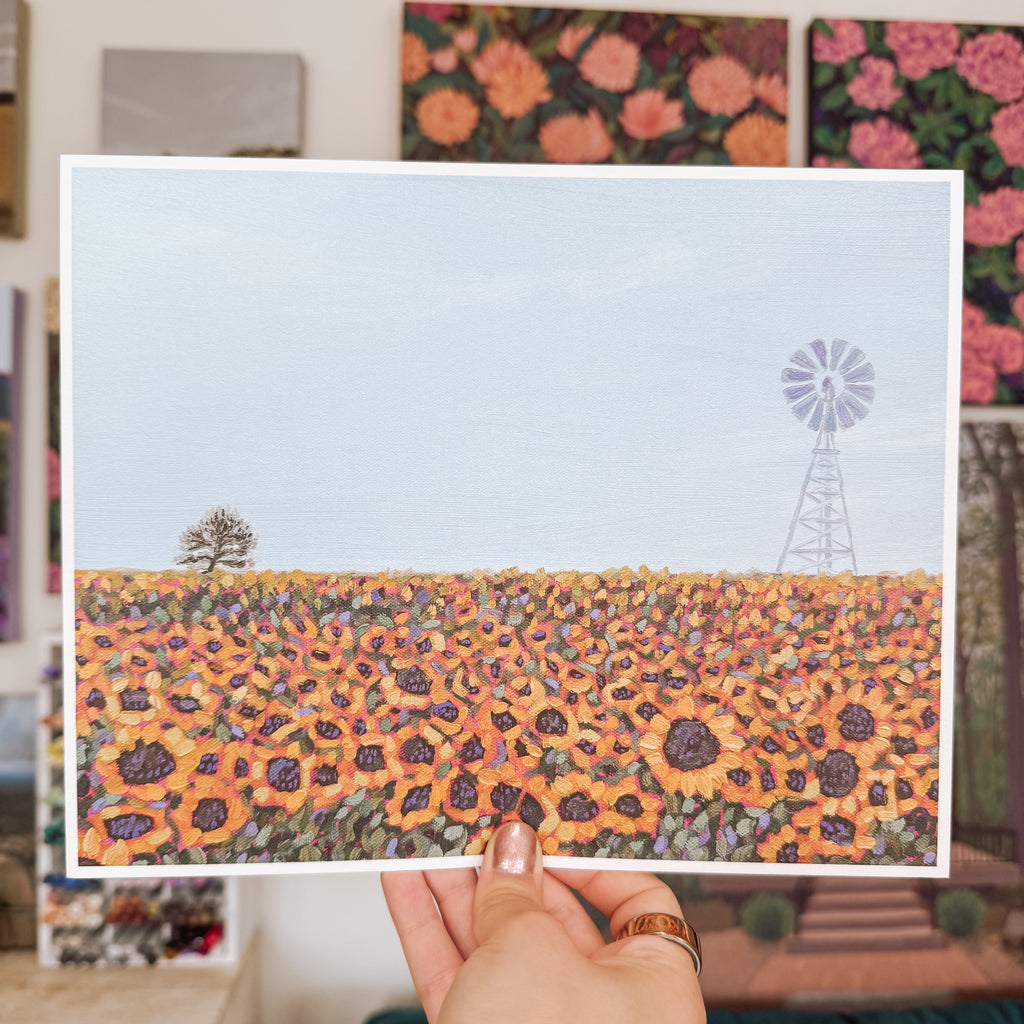 Enjoy a touch of warmth with this radiant sunflower field. This is the only painting from this painting that doesn't have a mountain in the background, but because of the radiant yellow flowers, I felt it tied in nicely with the others. This is actually the painting that inspired the rest, so in a way, it's the trailblazer for the series!